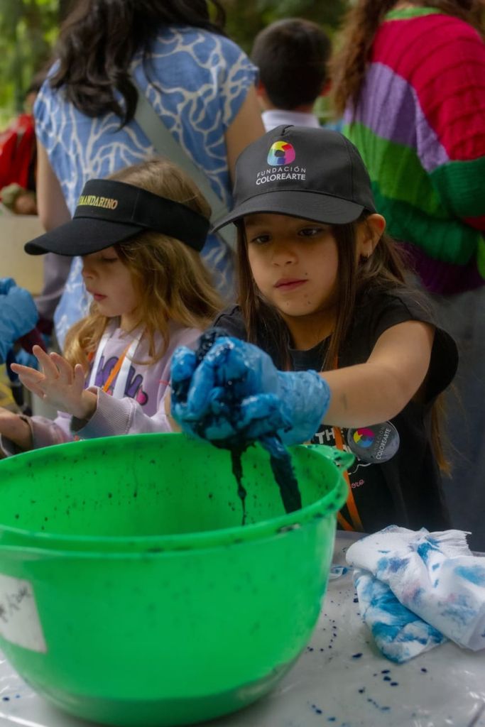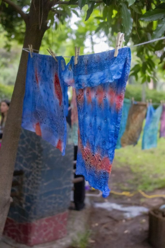 Luego, vivieron una entretenida actividad de teñido, donde cada participante, utilizando la técnica de teñido por reserva —en la que ya eran expertos después del proceso del proyecto—, personalizó su propia bandana. Cada estudiante se llevó su creación a casa como recuerdo de la experiencia y del trabajo realizado durante el año en torno a los humedales.